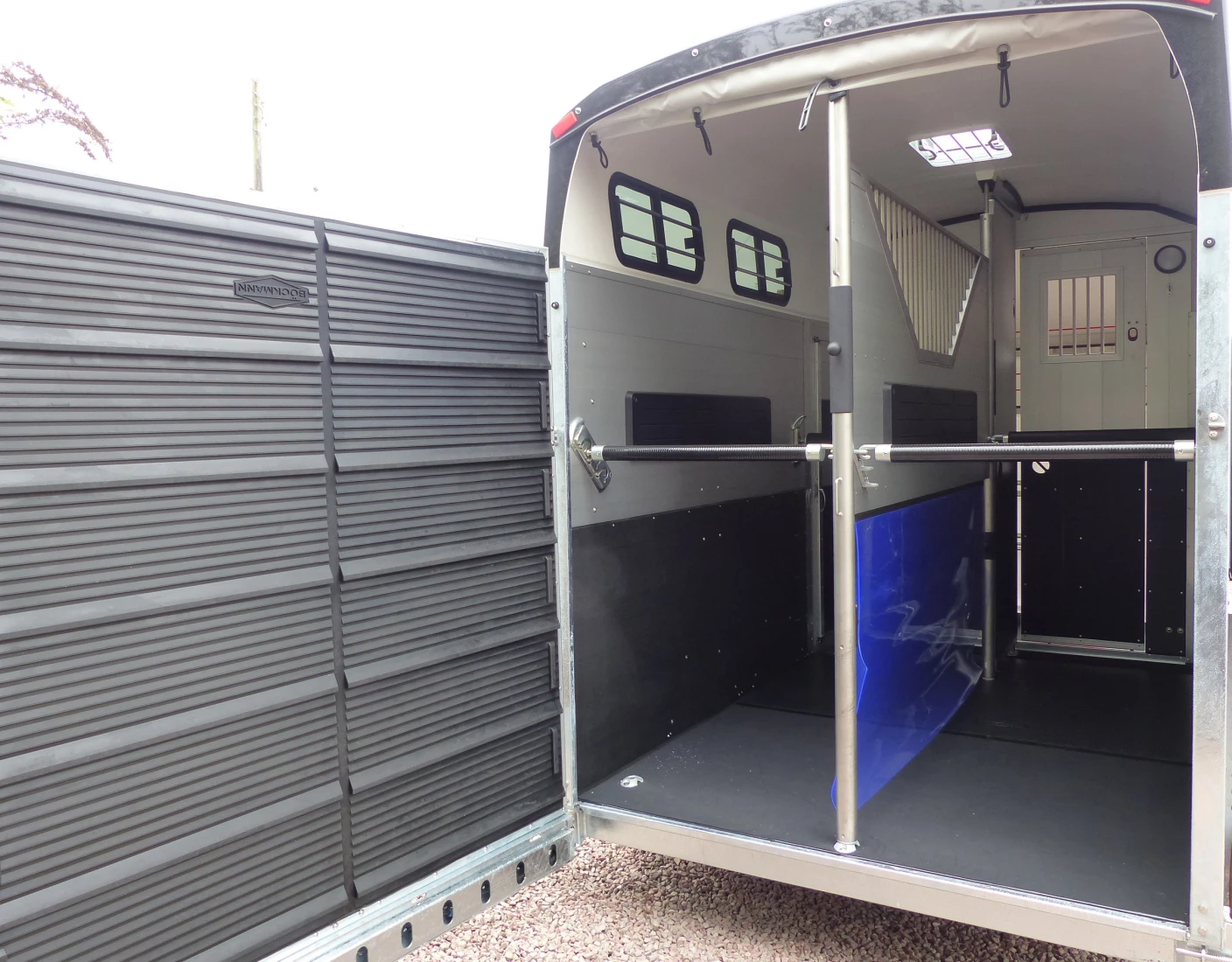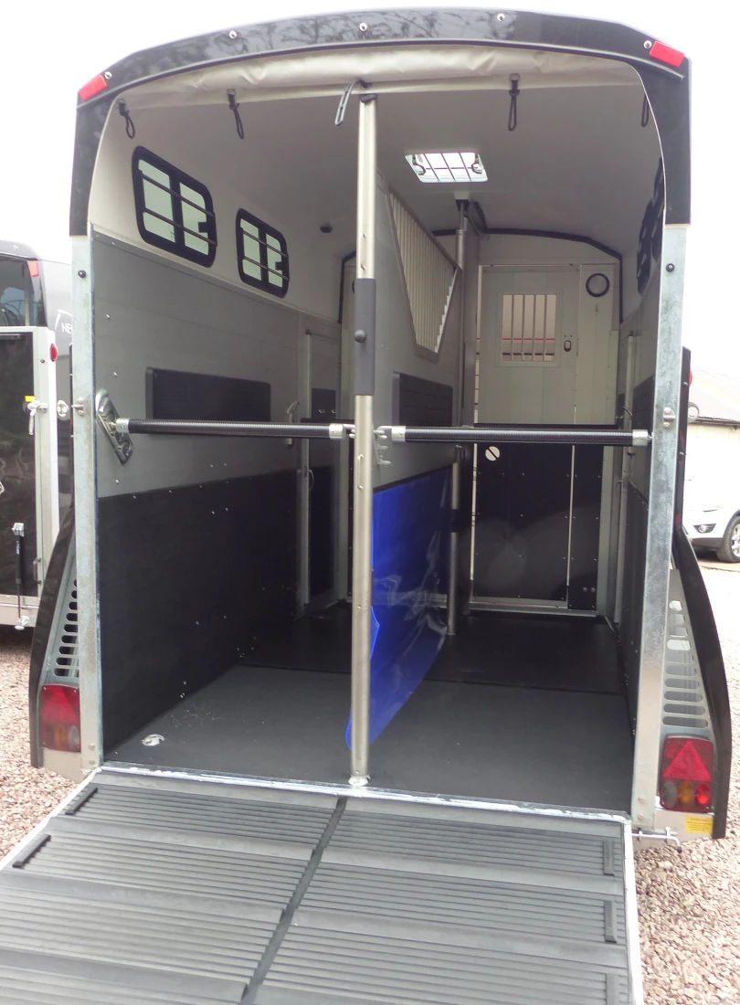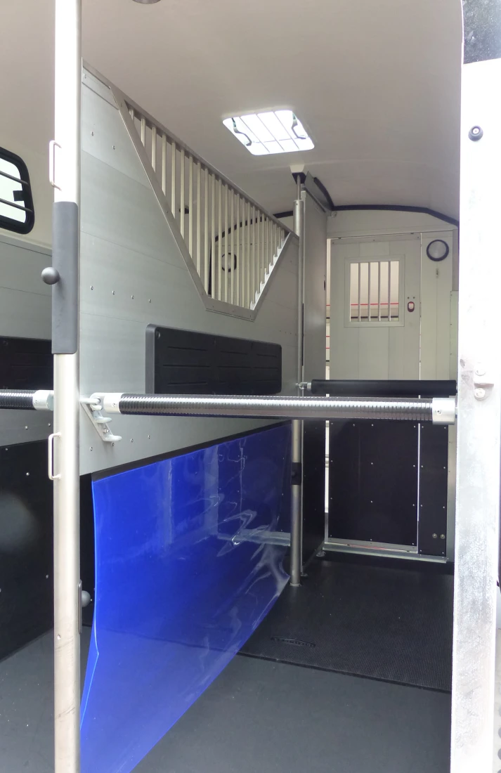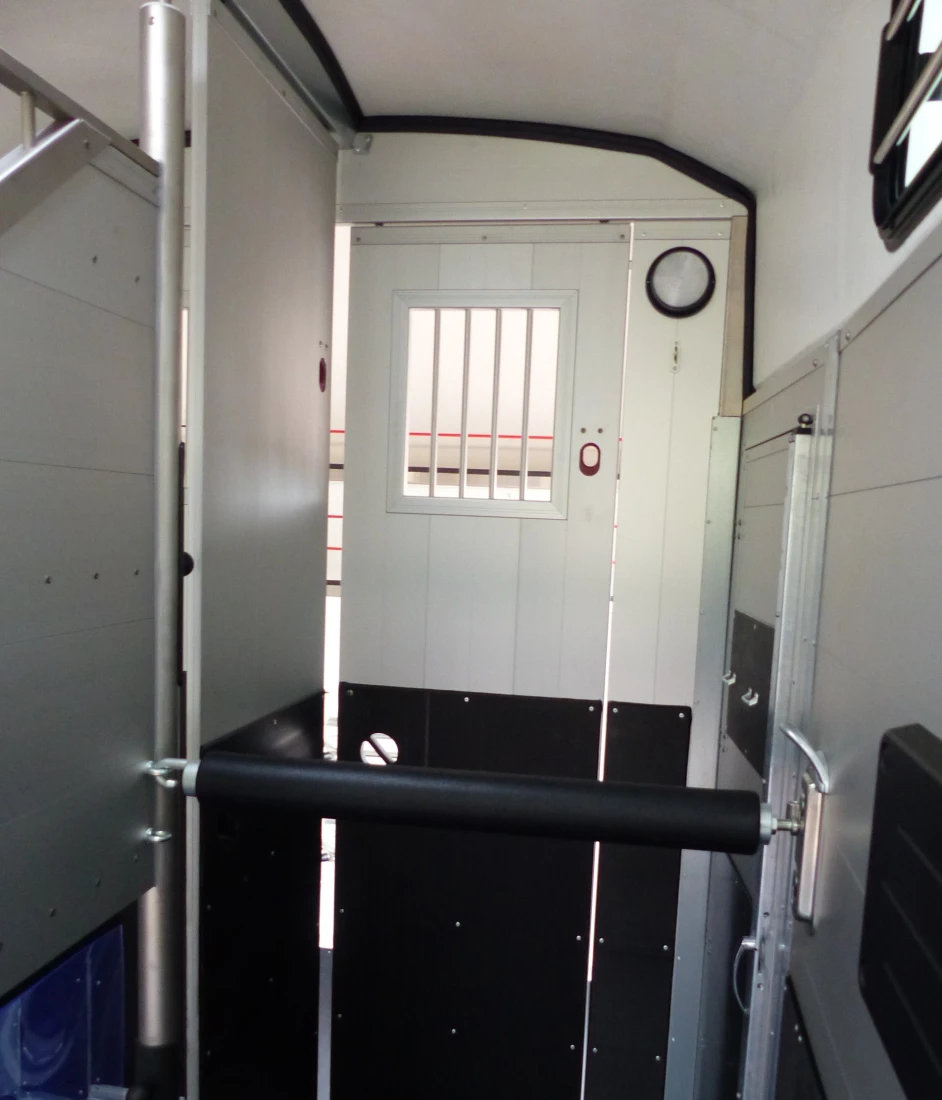 This trailer has been fitted with cables, polyester braces, spare wheel, grid above partition and a door into the horse compartment on the left side.