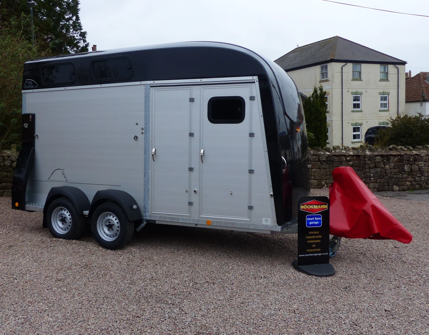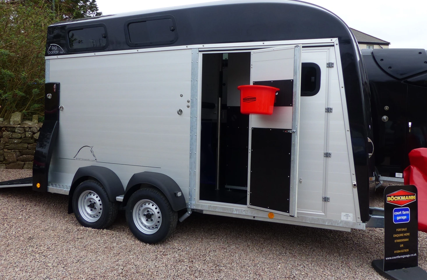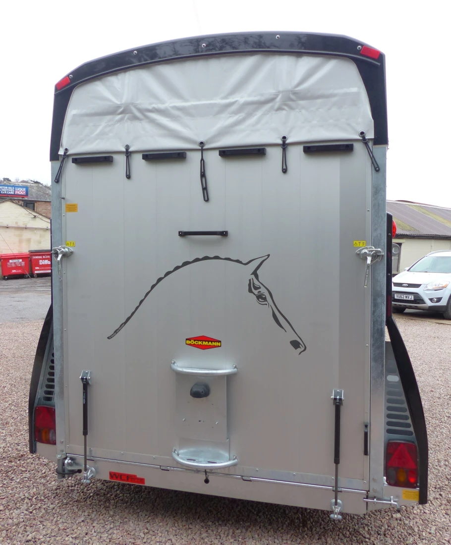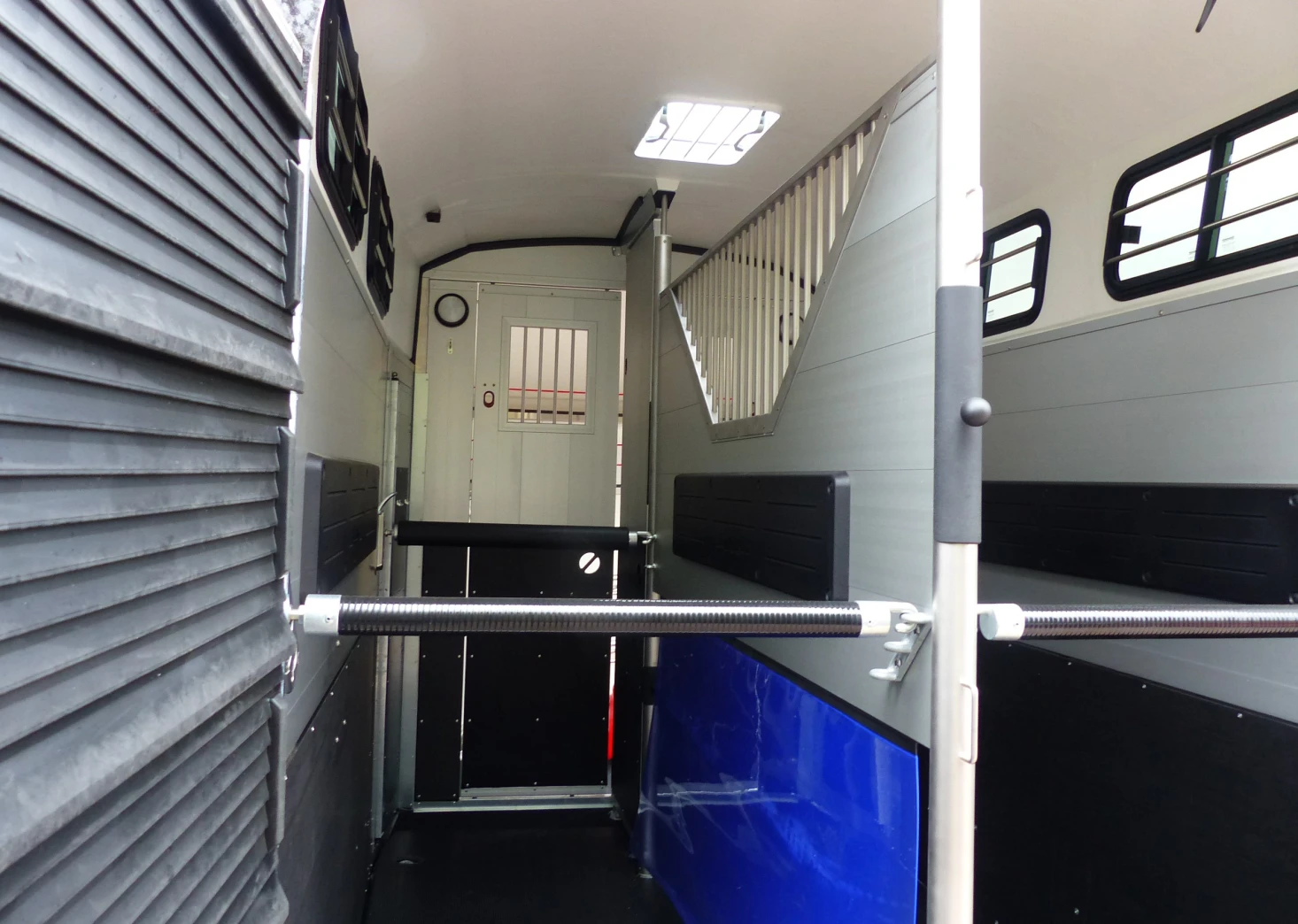 This trailer has been fitted with cables, polyester braces, spare wheel, grid above partition and a door into the horse compartment on the left side.