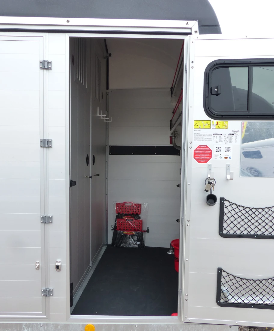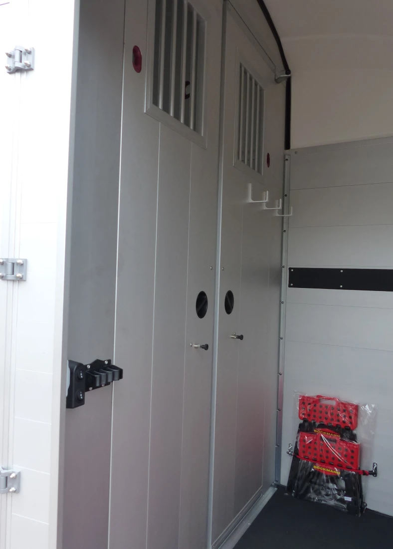 Unique room division concept: The new Big Portax stable with an inside width of 1850 mm and an inside height of 2400 mm is not only a real space miracle, but also has an stall partition wall system, which allows the transport of two horses without allowing contact between the horses. The partition wall system consists of two parts, the swivelling door in the front area and the swivelling rear area. The door in the front area can be swivelled to both sides and can also be fixed. The rear part of the partition wall can also be easily moved to the side so that the transport of mare and foal is effortless. The Big Portax stable is also equipped with a large tack room. The partition wall to the tack room has two doors so that both horses can be easily reached independently of each other.