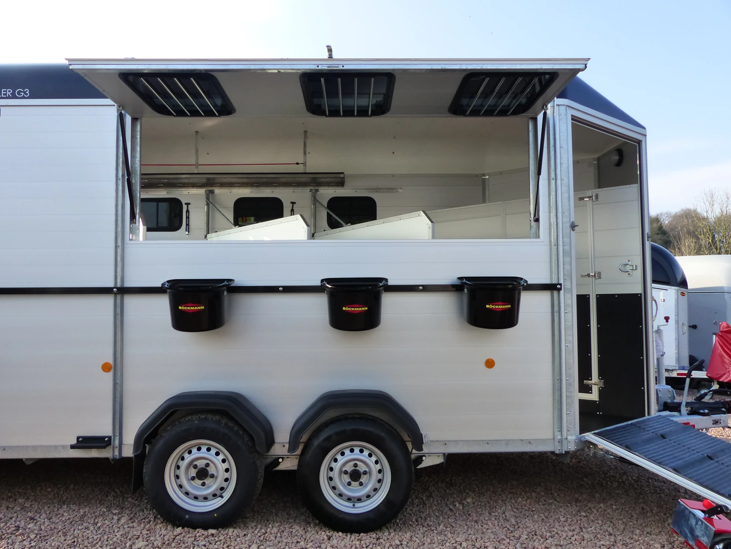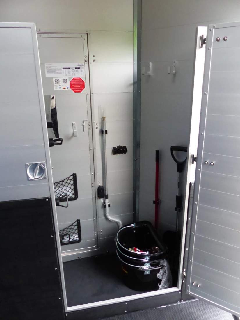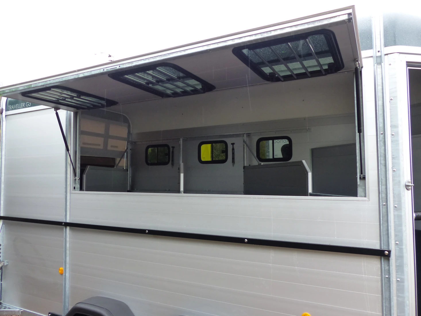 Double and triple benefits: With the Traveller G 3 you can transport three large horses at once - in the position that the horses prefer - standing diagonally. The very robust G models with their all-round steel bar are equipped with telescopic aluminium divider walls with a PVC curtain that can be adjusted at the side.